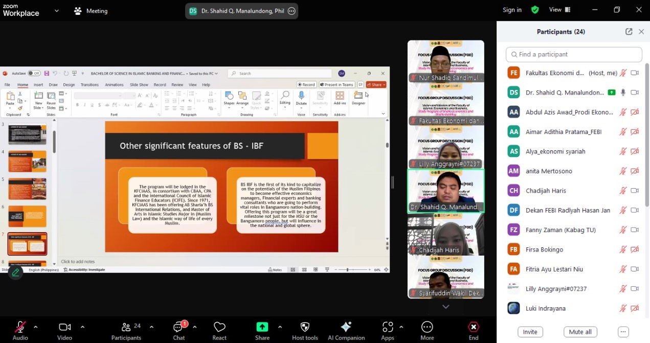 Kegiatan FGD melibatkan seluruh pihak yang terkait untuk membahas satu tema secara terfokus yang dipimpin oleh seorang moderator. Moderator dalam kegiatan ini adalah Ketua Prodi Perbankan Syariah Nur Shadiq Sandimula, ME. Kemudian dibuka oleh Dekan FEBI Dr. Radlyah Hasan Jan, M.Si. Adapun pihak Mindanao State University yang diundang hadir dalam diskusi ini adalah Prof. Dr. Shahid Q. Manalundong yang menjabat sebagai pimpinan College Islamic Finance and Banking di Mindanao State University.