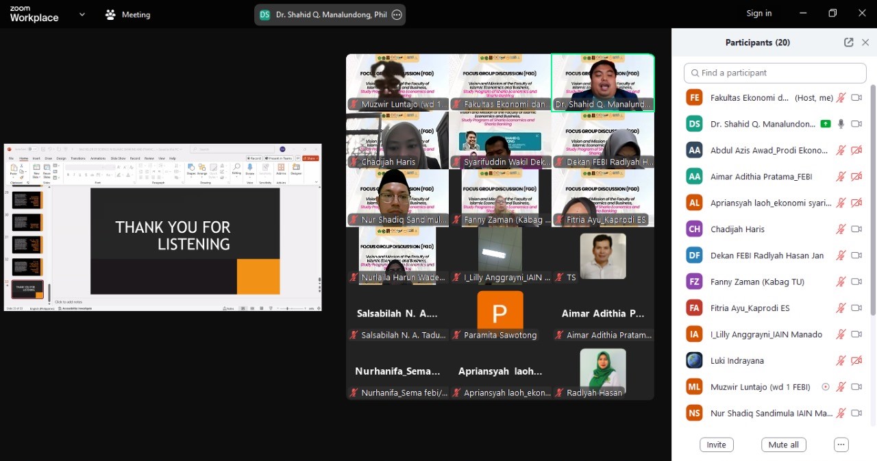 Kamis, (23 November 2023) FEBI IAIN Manado menyelenggarakan kegiatan FGD secara daring dengan Mindanao State University dengan tajuk Vision and Mission of the Faculty of Islamic Economics and Business, Study Program of Sharia Economics and Sharia Banking. Kegiatan ini dilangsungkan dslam rangka untuk meninjau visi dan misi Fakultas dan Program Studi yang ada di FEBI IAIN Manado demi menyelaraskan dengan perkembangan ekonomi dan bisnis secara global dan internasional.