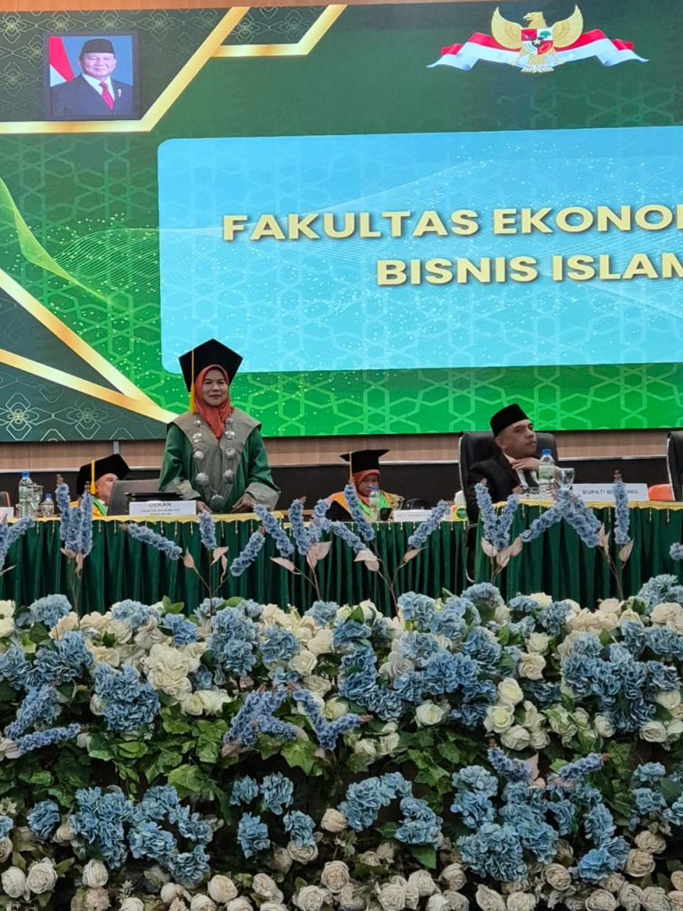 Pada wisuda kali ini FEBI mewisuda sejumlah 43 alumni yang terdiri dari alumni prodi Ekonomi Syariah 37 orang dan Perbankan Syariah 6 orang. Para peserta mendengarkan secara khidmat orasi ilmiah yang langsung dibawakan oleh Rektor IAIN Manado Prof. Dr. Ahmad Rajafi, M.H.I yang berpesan kepada seluruh wisudawan untuk menjaga nama baik kampus dengan memelihara integritas diri.